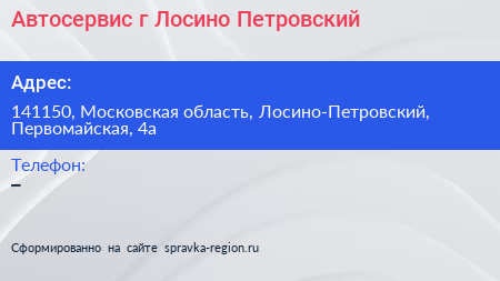 Автосервис, г. Лосино-Петровский по адресу 141150, Московская область, Лосино-Петровский, Первомайская, 4а в дальнейшем Организация, размещена в следующих категориях:
