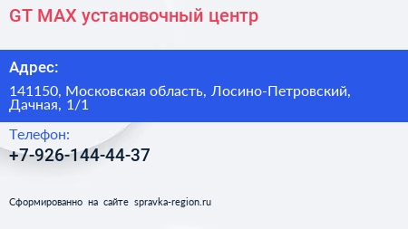GT-MAX, установочный центр по адресу 141150, Московская область, Лосино-Петровский, Дачная, 1/1 в дальнейшем Организация, размещена в следующих категориях: