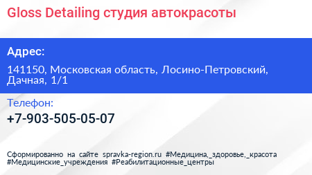 Gloss Detailing, студия автокрасоты по адресу 141150, Московская область, Лосино-Петровский, Дачная, 1/1 в дальнейшем Организация, размещена в следующих категориях: