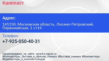 Канпласт по адресу 141150, Московская область, Лосино-Петровский, Первомайская, 1 ст14 в дальнейшем Организация, размещена в следующих категориях: