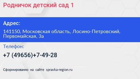 Родничок, детский сад №1 по адресу 141150, Московская область, Лосино-Петровский, Первомайская, 3а в дальнейшем Организация, размещена в следующих категориях: