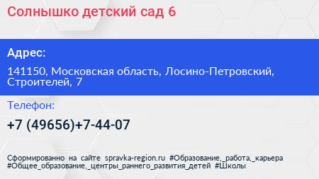 Солнышко, детский сад №6 по адресу 141150, Московская область, Лосино-Петровский, Строителей, 7 в дальнейшем Организация, размещена в следующих категориях: