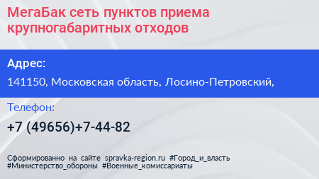 МегаБак, сеть пунктов приема крупногабаритных отходов по адресу 141150, Московская область, Лосино-Петровский, в дальнейшем Организация, размещена в следующих категориях: