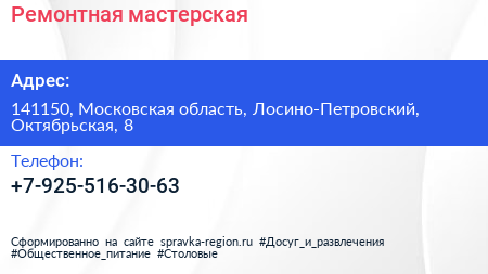 Ремонтная мастерская по адресу 141150, Московская область, Лосино-Петровский, Октябрьская, 8 в дальнейшем Организация, размещена в следующих категориях: