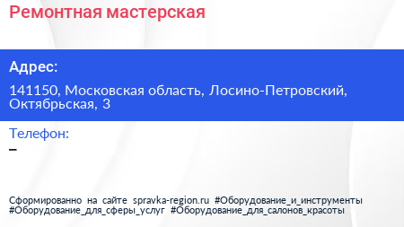 Ремонтная мастерская по адресу 141150, Московская область, Лосино-Петровский, Октябрьская, 3 в дальнейшем Организация, размещена в следующих категориях: