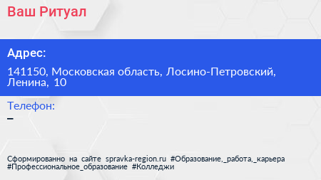 Ваш Ритуал по адресу 141150, Московская область, Лосино-Петровский, Ленина, 10 в дальнейшем Организация, размещена в следующих категориях: