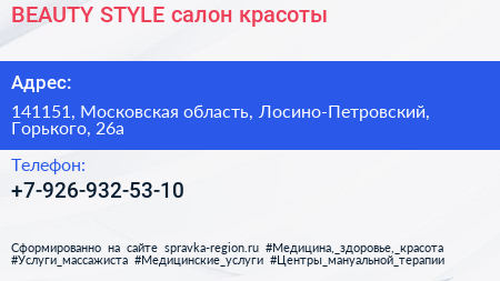 BEAUTY STYLE, салон красоты по адресу 141151, Московская область, Лосино-Петровский, Горького, 26а в дальнейшем Организация, размещена в следующих категориях: