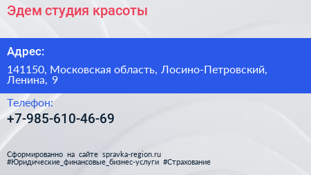 Эдем, студия красоты по адресу 141150, Московская область, Лосино-Петровский, Ленина, 9 в дальнейшем Организация, размещена в следующих категориях: