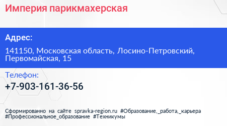 Империя, парикмахерская по адресу 141150, Московская область, Лосино-Петровский, Первомайская, 15 в дальнейшем Организация, размещена в следующих категориях: