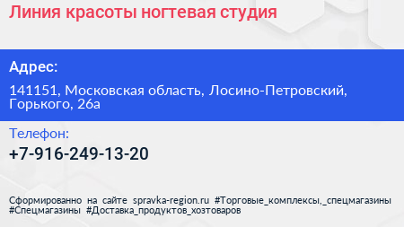Линия красоты, ногтевая студия по адресу 141151, Московская область, Лосино-Петровский, Горького, 26а в дальнейшем Организация, размещена в следующих категориях: