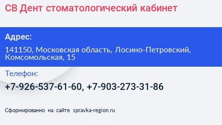 СВ Дент, стоматологический кабинет по адресу 141150, Московская область, Лосино-Петровский, Комсомольская, 15 в дальнейшем Организация, размещена в следующих категориях: