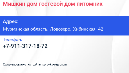 Мишкин дом, гостевой дом-питомник по адресу Мурманская область, Ловозеро, Хибинская, 42 в дальнейшем Организация, размещена в следующих категориях: