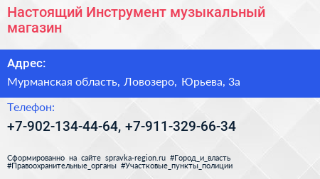 Настоящий Инструмент, музыкальный магазин по адресу Мурманская область, Ловозеро, Юрьева, 3а в дальнейшем Организация, размещена в следующих категориях: