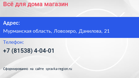 Всё для дома, магазин по адресу Мурманская область, Ловозеро, Данилова, 21 в дальнейшем Организация, размещена в следующих категориях: