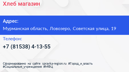 Хлеб, магазин по адресу Мурманская область, Ловозеро, Советская улица, 19 в дальнейшем Организация, размещена в следующих категориях: