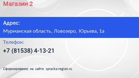 Магазин №2 по адресу Мурманская область, Ловозеро, Юрьева, 1а в дальнейшем Организация, размещена в следующих категориях: