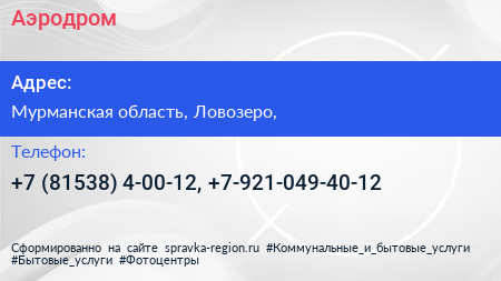 Аэродром по адресу Мурманская область, Ловозеро, в дальнейшем Организация, размещена в следующих категориях: