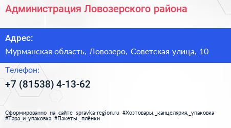 Администрация Ловозерского района по адресу Мурманская область, Ловозеро, Советская улица, 10 в дальнейшем Организация, размещена в следующих категориях: