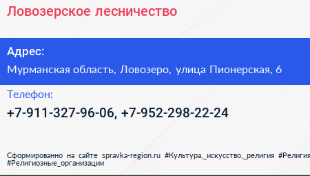 Ловозерское лесничество по адресу Мурманская область, Ловозеро, улица Пионерская, 6 в дальнейшем Организация, размещена в следующих категориях: