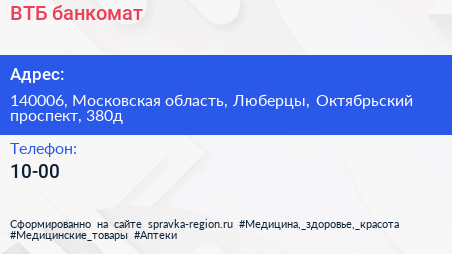 ВТБ, банкомат по адресу 140006, Московская область, Люберцы, Октябрьский проспект, 380д в дальнейшем Организация, размещена в следующих категориях: