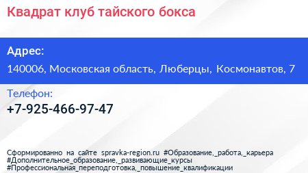 Квадрат, клуб тайского бокса по адресу 140006, Московская область, Люберцы, Космонавтов, 7 в дальнейшем Организация, размещена в следующих категориях:
