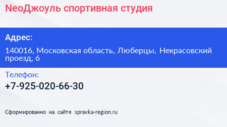 NeoДжоуль, спортивная студия по адресу 140016, Московская область, Люберцы, Некрасовский проезд, 6 в дальнейшем Организация, размещена в следующих категориях: