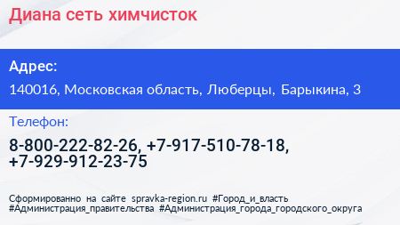 Диана, сеть химчисток по адресу 140016, Московская область, Люберцы, Барыкина, 3 в дальнейшем Организация, размещена в следующих категориях: