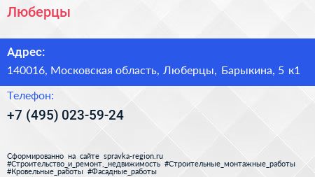Люберцы по адресу 140016, Московская область, Люберцы, Барыкина, 5 к1 в дальнейшем Организация, размещена в следующих категориях: