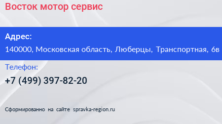 Восток мотор сервис по адресу 140000, Московская область, Люберцы, Транспортная, 6в в дальнейшем Организация, размещена в следующих категориях: