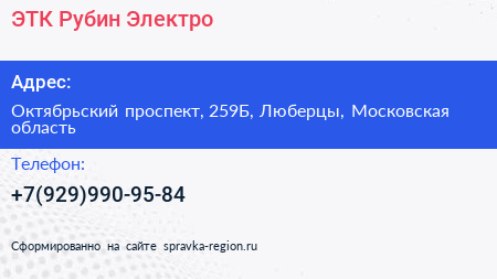 ЭТК Рубин-Электро по адресу Октябрьский проспект, 259Б, Люберцы, Московская область в дальнейшем Организация, размещена в следующих категориях: