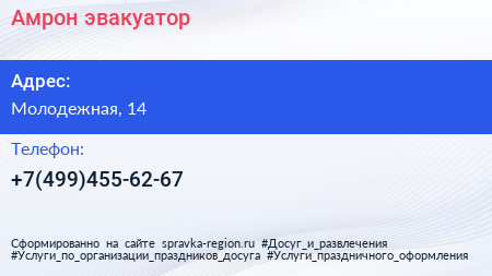 Амрон эвакуатор по адресу Молодежная, 14 в дальнейшем Организация, размещена в следующих категориях: