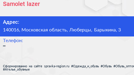 Samolet.lazer по адресу 140016, Московская область, Люберцы, Барыкина, 3 в дальнейшем Организация, размещена в следующих категориях: