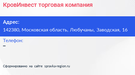 КровИнвест, торговая компания по адресу 142380, Московская область, Любучаны, Заводская, 16 в дальнейшем Организация, размещена в следующих категориях: