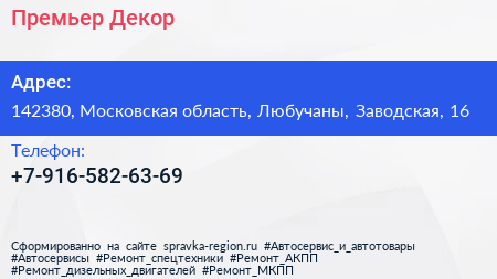 Премьер Декор по адресу 142380, Московская область, Любучаны, Заводская, 16 в дальнейшем Организация, размещена в следующих категориях: