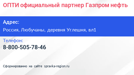 ОПТИ, официальный партнер Газпром нефть по адресу Опти, Старое Симферопольское шоссе, ДНТ "Углешня-3", Красные Холмы, городской округ Чехов, Московская область, Центральный федеральный округ, 142301, Россия в дальнейшем Организация, размещена в следующих категориях: