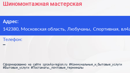 Шиномонтажная мастерская по адресу 142380, Московская область, Любучаны, Спортивная, вл4а в дальнейшем Организация, размещена в следующих категориях:
