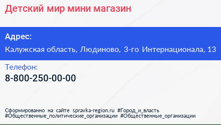 Детский мир, мини-магазин по адресу Калужская область, Людиново, 3-го Интернационала, 13 в дальнейшем Организация, размещена в следующих категориях: