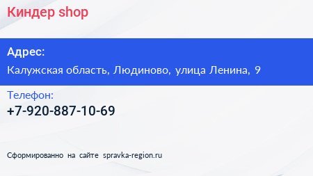Киндер shop по адресу Калужская область, Людиново, улица Ленина, 9 в дальнейшем Организация, размещена в следующих категориях: