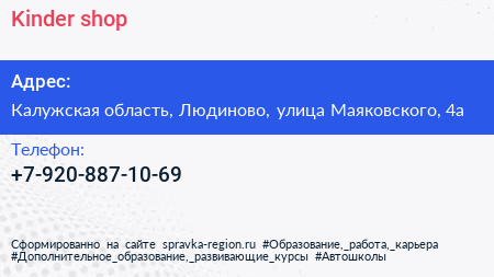 Kinder shop по адресу Калужская область, Людиново, улица Маяковского, 4а в дальнейшем Организация, размещена в следующих категориях: