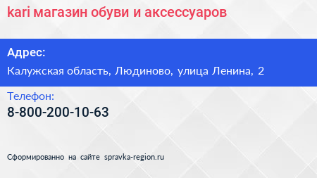 kari, магазин обуви и аксессуаров по адресу Калужская область, Людиново, улица Ленина, 2 в дальнейшем Организация, размещена в следующих категориях: