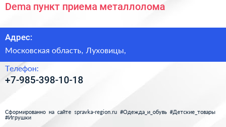 Dema, пункт приема металлолома по адресу Московская область, Луховицы, в дальнейшем Организация, размещена в следующих категориях:
