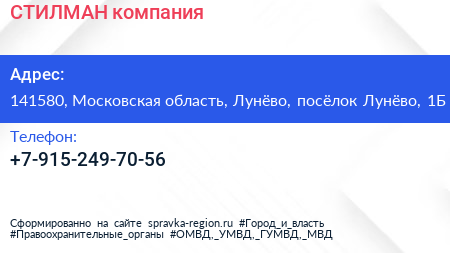 СТИЛМАН, компания по адресу 141580, Московская область, Лунёво, посёлок Лунёво, 1Б в дальнейшем Организация, размещена в следующих категориях: