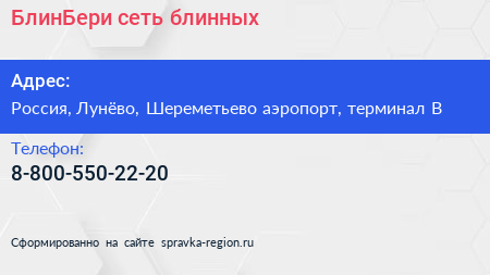 БлинБери, сеть блинных по адресу вл37 с1, Шереметьевское шоссе, транспортная зона Шереметьево, Химки, городской округ Химки, Московская область, Центральный федеральный округ, 141426, Россия в дальнейшем Организация, размещена в следующих категориях: