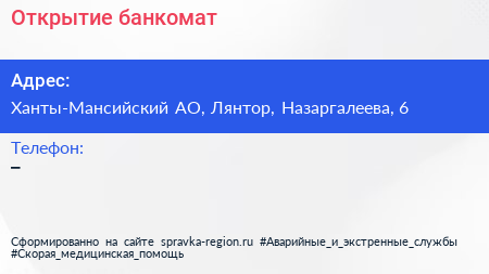 Открытие, банкомат по адресу Ханты-Мансийский АО, Лянтор, Назаргалеева, 6 в дальнейшем Организация, размещена в следующих категориях: