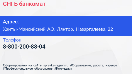 СНГБ, банкомат по адресу Ханты-Мансийский АО, Лянтор, Назаргалеева, 22 в дальнейшем Организация, размещена в следующих категориях: