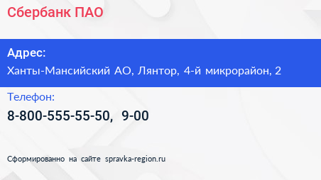 Сбербанк, ПАО по адресу Ханты-Мансийский АО, Лянтор, 4-й микрорайон, 2 в дальнейшем Организация, размещена в следующих категориях:
