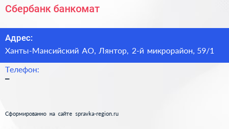 Сбербанк, банкомат по адресу Ханты-Мансийский АО, Лянтор, 2-й микрорайон, 59/1 в дальнейшем Организация, размещена в следующих категориях: