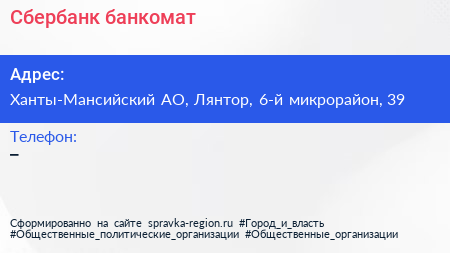 Сбербанк, банкомат по адресу Ханты-Мансийский АО, Лянтор, 6-й микрорайон, 39 в дальнейшем Организация, размещена в следующих категориях: