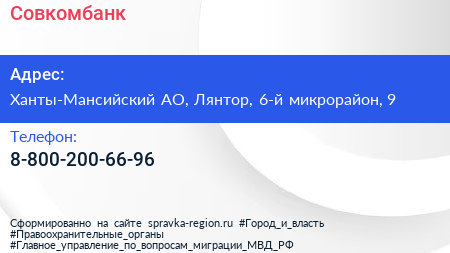 Совкомбанк по адресу Ханты-Мансийский АО, Лянтор, 6-й микрорайон, 9 в дальнейшем Организация, размещена в следующих категориях: