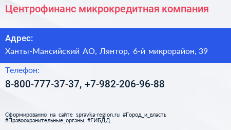 Центрофинанс, микрокредитная компания по адресу Ханты-Мансийский АО, Лянтор, 6-й микрорайон, 39 в дальнейшем Организация, размещена в следующих категориях:
